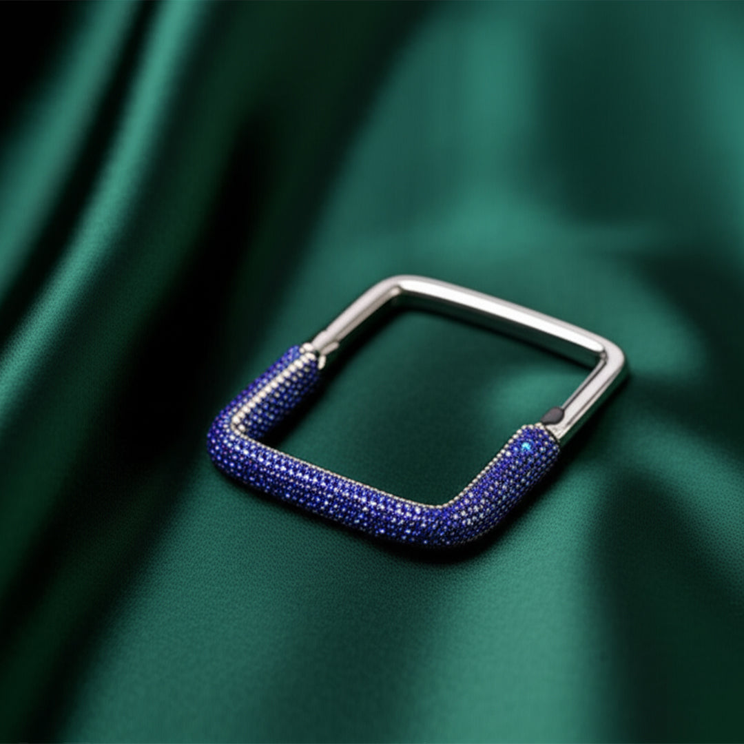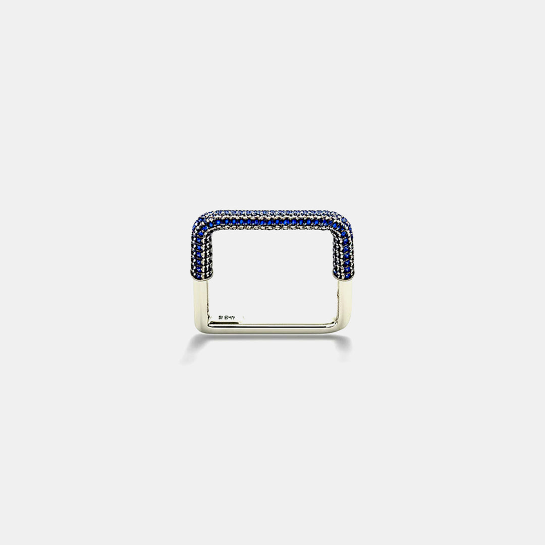 This exquisite ring features a sleek, modern bar design crafted from polished metal. The rectangular top is completely adorned with a vibrant pave setting of brilliant blue gemstones, creating a striking contrast and a luxurious sparkle. The bold, geometric shape and the deep, rich color of the stones make this a contemporary statement piece. The open-center design adds a touch of negative space, enhancing its minimalist appeal. Perfect for adding a pop of color and sophisticated flair to any ensemble, this ring is a testament to modern elegance and timeless design.