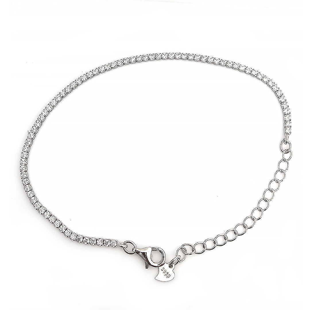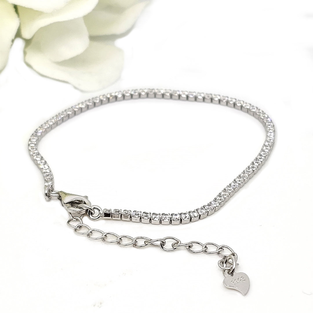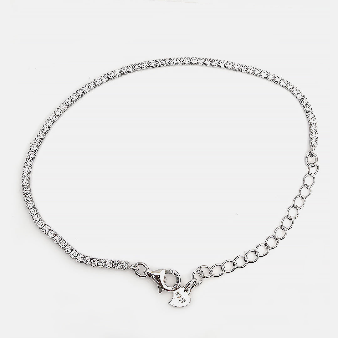 The Celestia Dainty Tennis Bracelet brings delicate sophistication to your jewelry collection. Designed with a fine row of shimmering cubic zirconia stones, it offers a lightweight, minimalist look that sparkles with every movement. Set in a polished silver-tone finish, this elegant bracelet features a secure lobster clasp with an adjustable chain for a customizable fit. A charming heart tag engraved with "925" adds a subtle touch of luxury. Perfect for everyday elegance or special occasions, this bracelet complements any outfit, whether worn solo or layered. The Celestia Bracelet is the epitome of grace in a refined, understated silhouette.