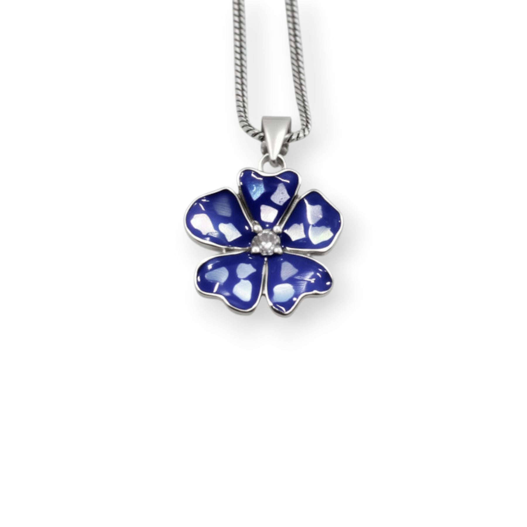 his exquisite jewelry set includes a pendant and a pair of matching earrings, all featuring a beautiful floral motif. The design is crafted from a silver-toned metal, with the petals of each flower meticulously detailed in a glossy, deep cobalt blue enamel. The enamel work is accented with lighter blue and white splatters, giving the pieces a unique, artistic texture reminiscent of a starry night or a watercolor painting.