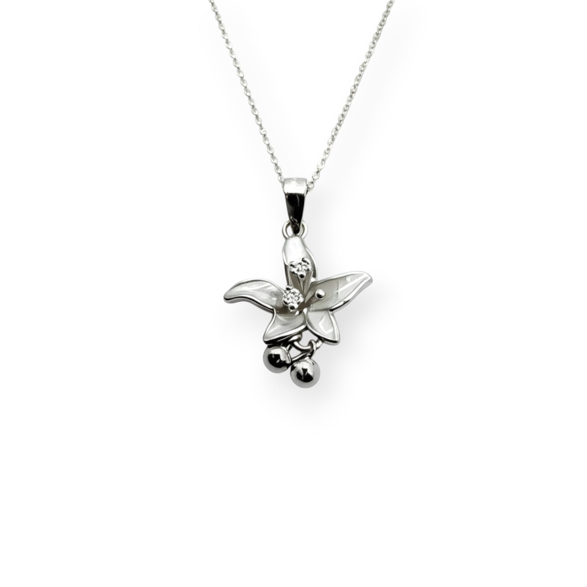This elegant jewelry set features a delicate lily-inspired pendant and matching stud earrings, all crafted from gleaming silver. The centerpiece of the pendant is a beautifully sculpted flower with a brilliant, sparkling stone at its heart, adding a touch of sophisticated glamour. Dangling from the lily are two polished silver spheres, creating gentle movement and a playful charm. The coordinating earrings mimic the flower's design on a smaller scale, each showcasing a single radiant stone. Perfect for adding a subtle yet stunning floral accent to any outfit, this set is a timeless accessory that transitions effortlessly from day to night.